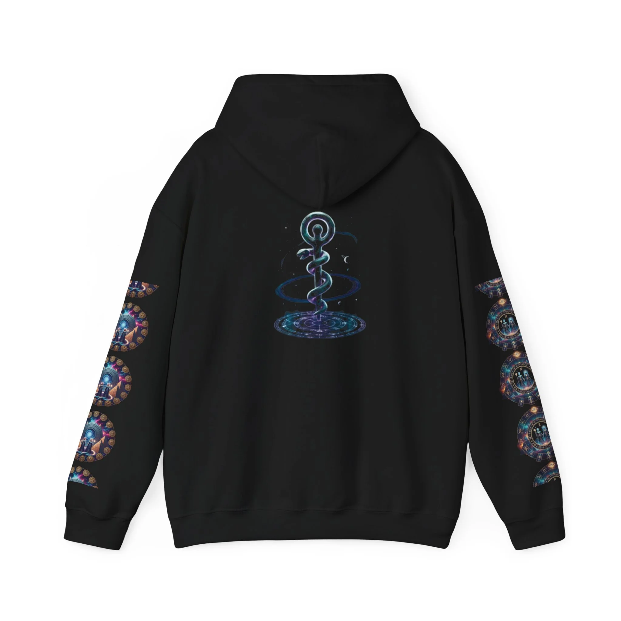 This cozy hooded sweatshirt blends celestial mystery with street-ready comfort. Soft, medium-heavy fleece holds a cool, teal Ophiuchus crest on the chest while the back features a luminous serpent-entwined staff rising from a pool of star-splattered galaxy—an image that feels equal parts myth and midnight sky. Wear it when you want a low-key statement that hints at astrology, late-night stargazing, or quiet introspection. The roomy kangaroo pocket and double-lined hood add everyday practicality, while the slightly oversized cut makes it easy to layer over tees or flannels. It’s the kind of hoodie you reach for when you’re settling into a long drive, a night at an observatory, or a slow coffee and sketch session.